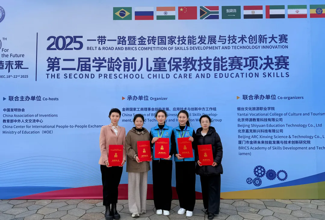 12月17日至22日,在2025“一带一路”暨金砖国家技能发展与技术创新大赛第二届学龄前儿童保教技能赛项决赛中,由学院学前教育系教师李明坤、赵玉宁、关聪指导,学生张悦、武晓乐组成的代表队荣获金奖,高校组团体第一名,李明坤、赵玉宁被评为优秀指导教师,学院荣获最佳组织奖。